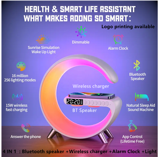 4 in 1 function : Wireless charging + Bluetooth speaker + 3-in-1 ambient light + alarm clock