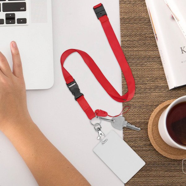 Cinta Portacarnet con botón de emergencia. Incluye: mosquetón removible, gancho para carnet y mosquetón metálico. De 90 X 1,5 cms.