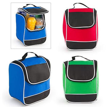 Lonchera elaborada en lona de poliester con recubrimiento de PVC, aluminizado interno, bicolor, con manija de agarrar, medida 22 cmts de ancho, 25 cmts de alto y 17 cmts de fuelle lateral