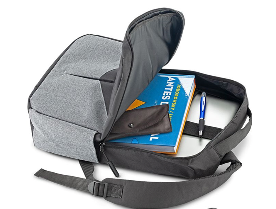 Morral Cooper en poliéster, con bolsillo para portátil de hasta 15”. Bolsillo frontal con cremalleray bolsillo lateral portabotella.