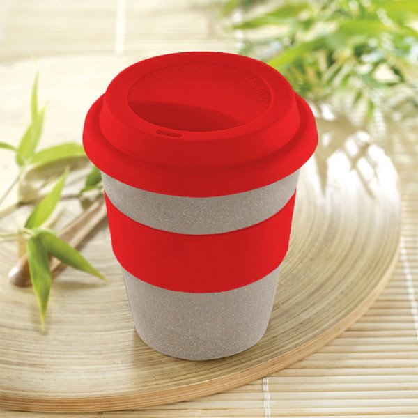 Mug elaborado en fibra de bambú. Con tapa y aro en silicona resistentes al calor.
