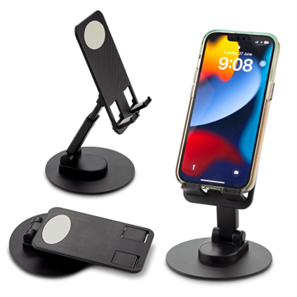 Soporte plástico, plegable con rotación de 360°. Accesorios antideslizantes en silicona